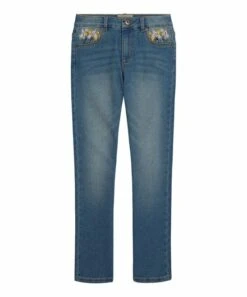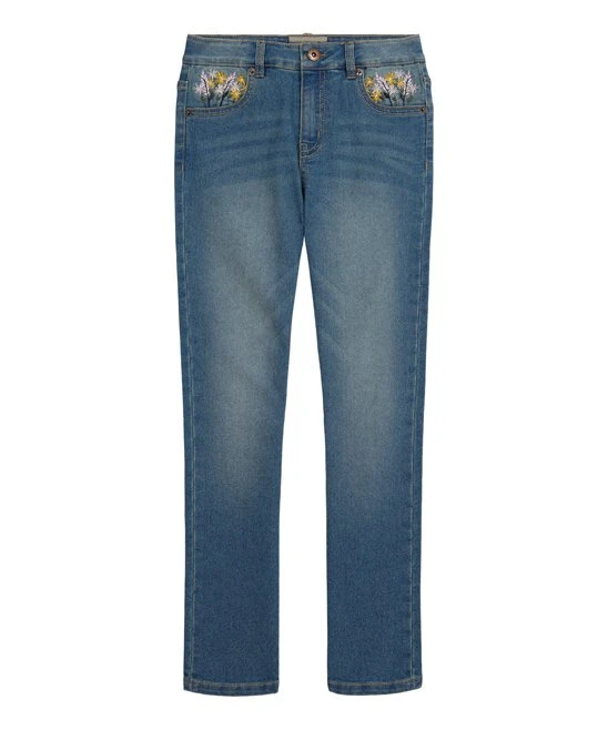 Casual straight-leg jeans with colorful floral details at the pockets and a classic high waist.