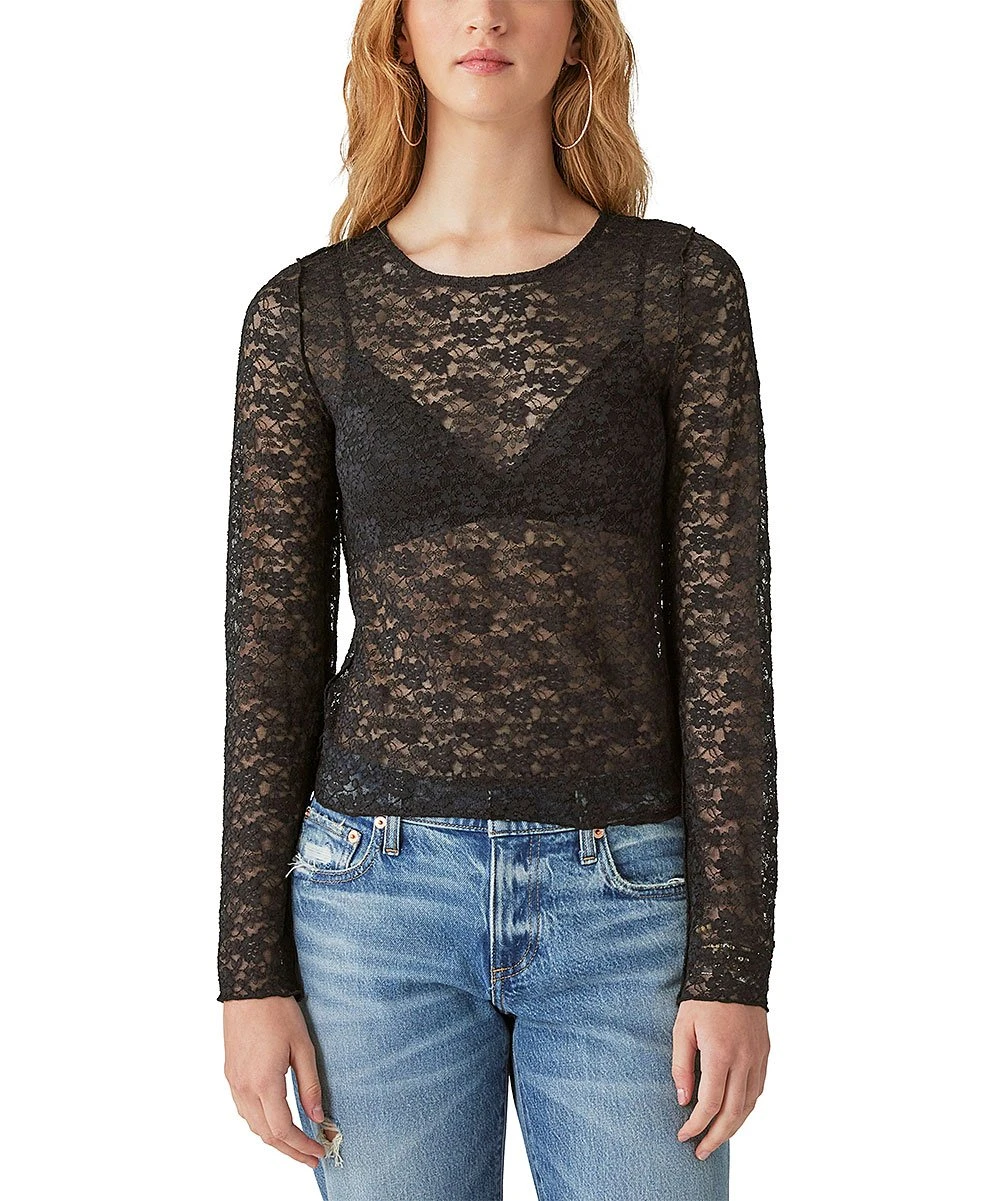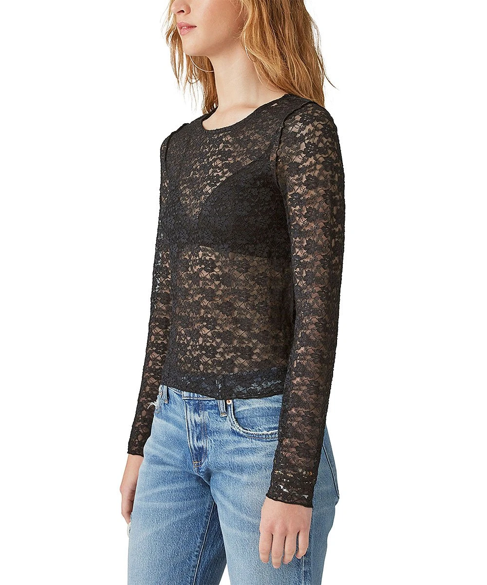 This black sheer long-sleeve top offers a lace design and a crewneck in a stretch-infused fabric.