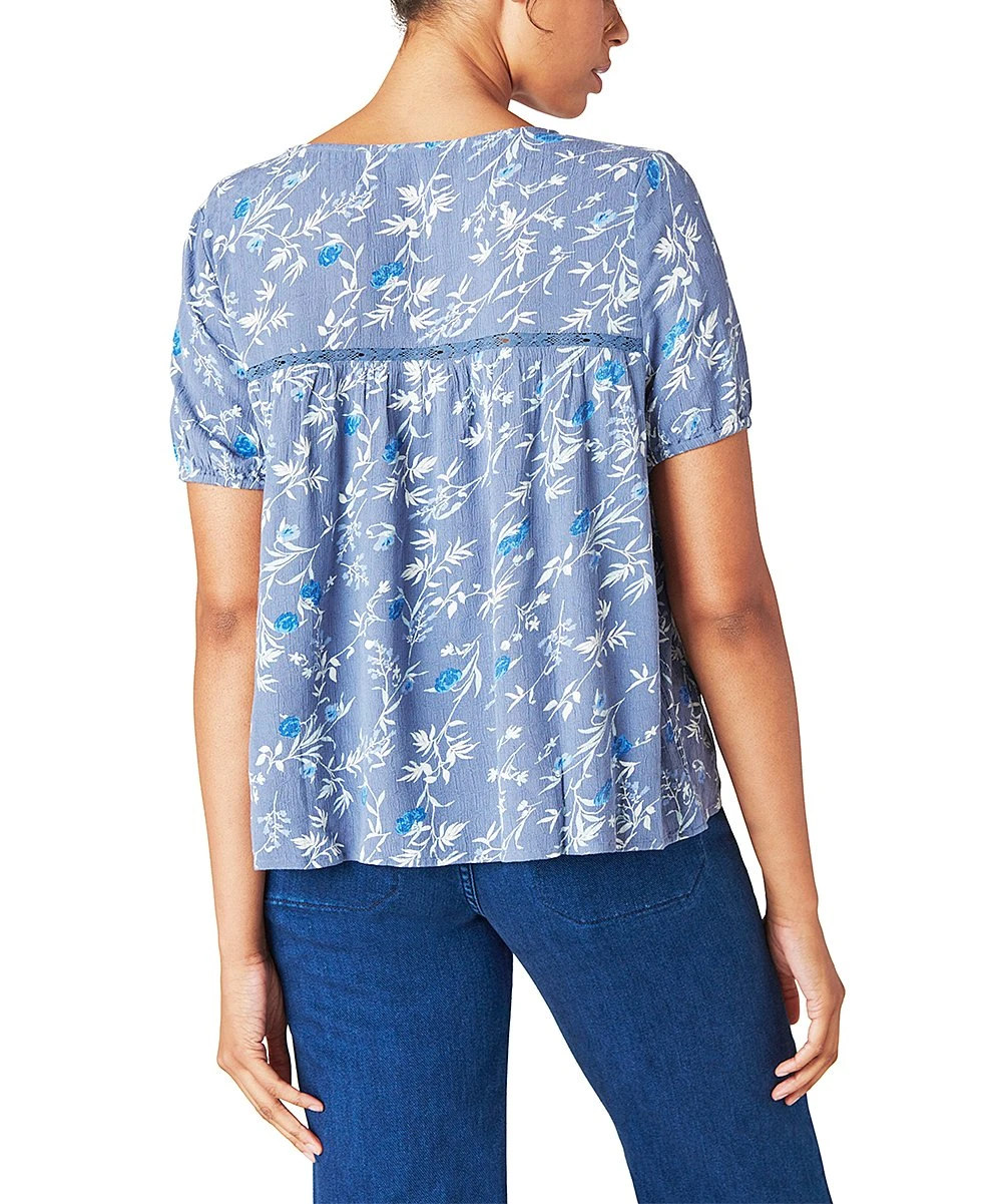 Accented with a tasseled corset-laced neckline and lace at the shoulders and back, this peasant top is your free-spirited soulmate.
