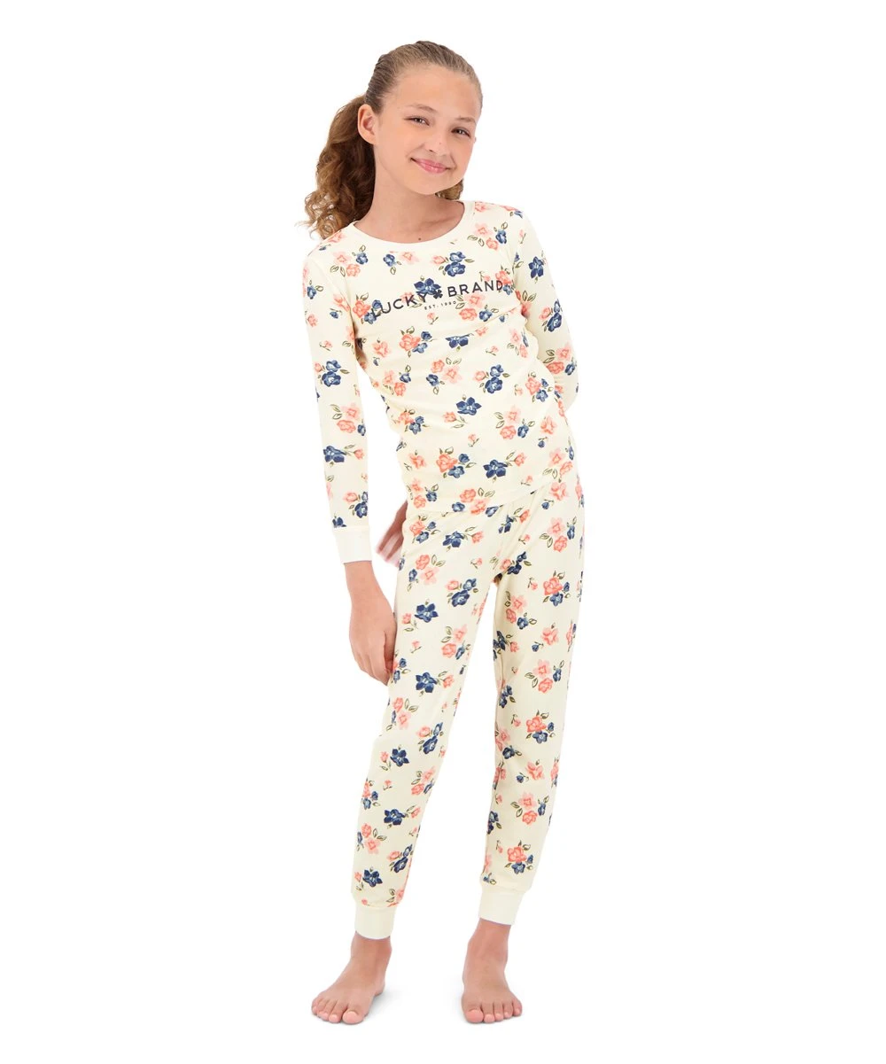 - Includes cream and blue floral long-sleeve crewneck tee and matching pajama pants (two pieces total)