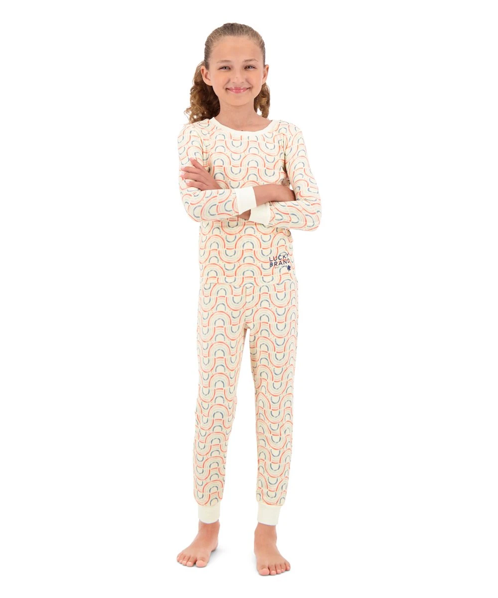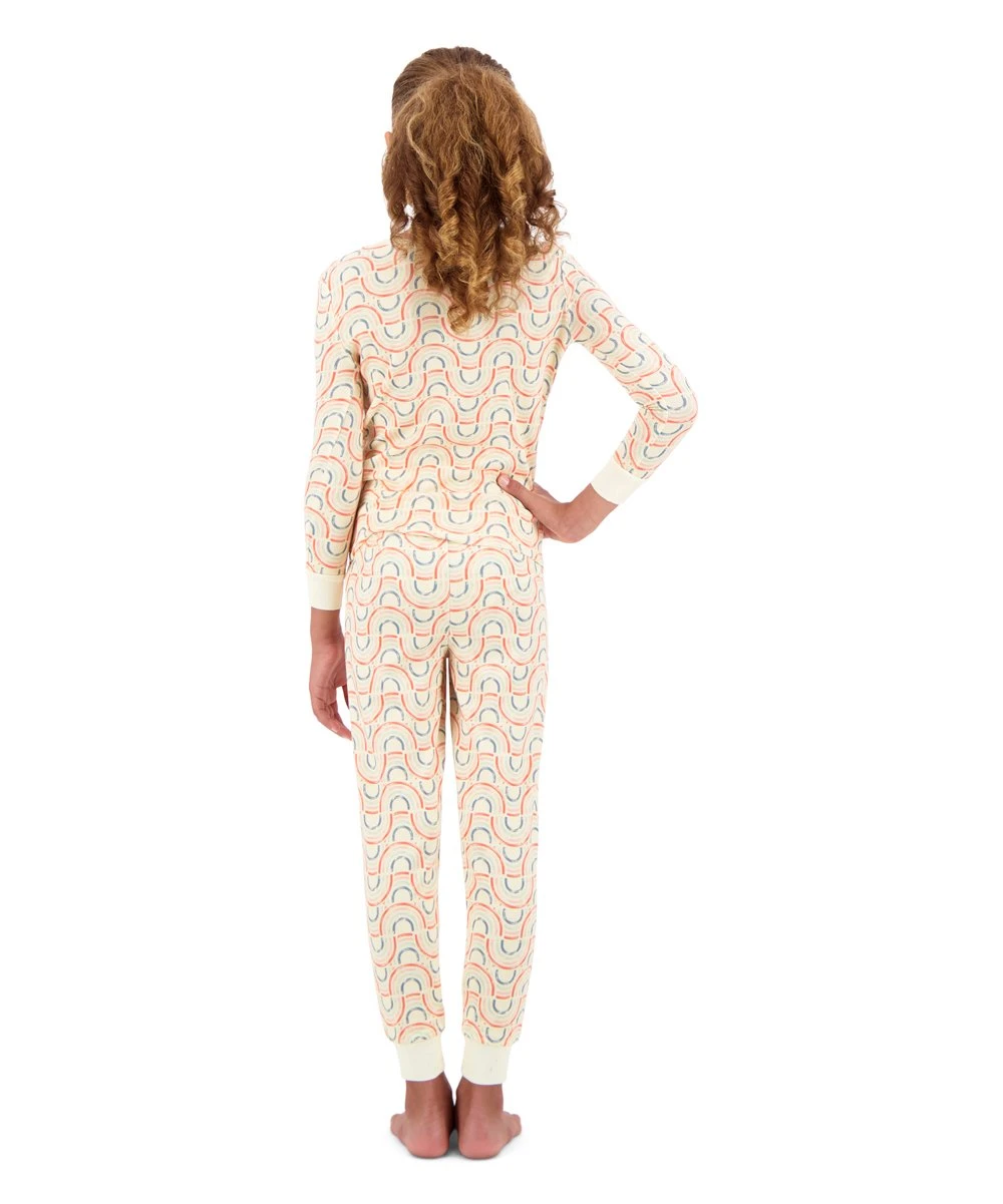 - Includes cream and blue rainbow long-sleeve crewneck tee and matching pajama pants (two pieces total)