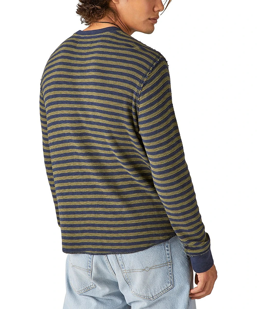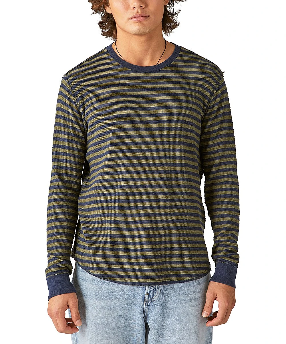 This striped tee offers long-sleeves and a crewneck in a thermal 100% cotton fabric.