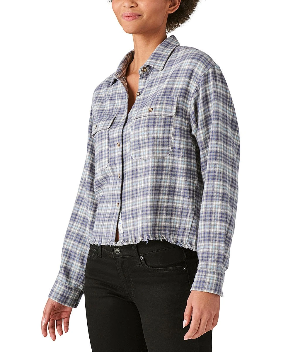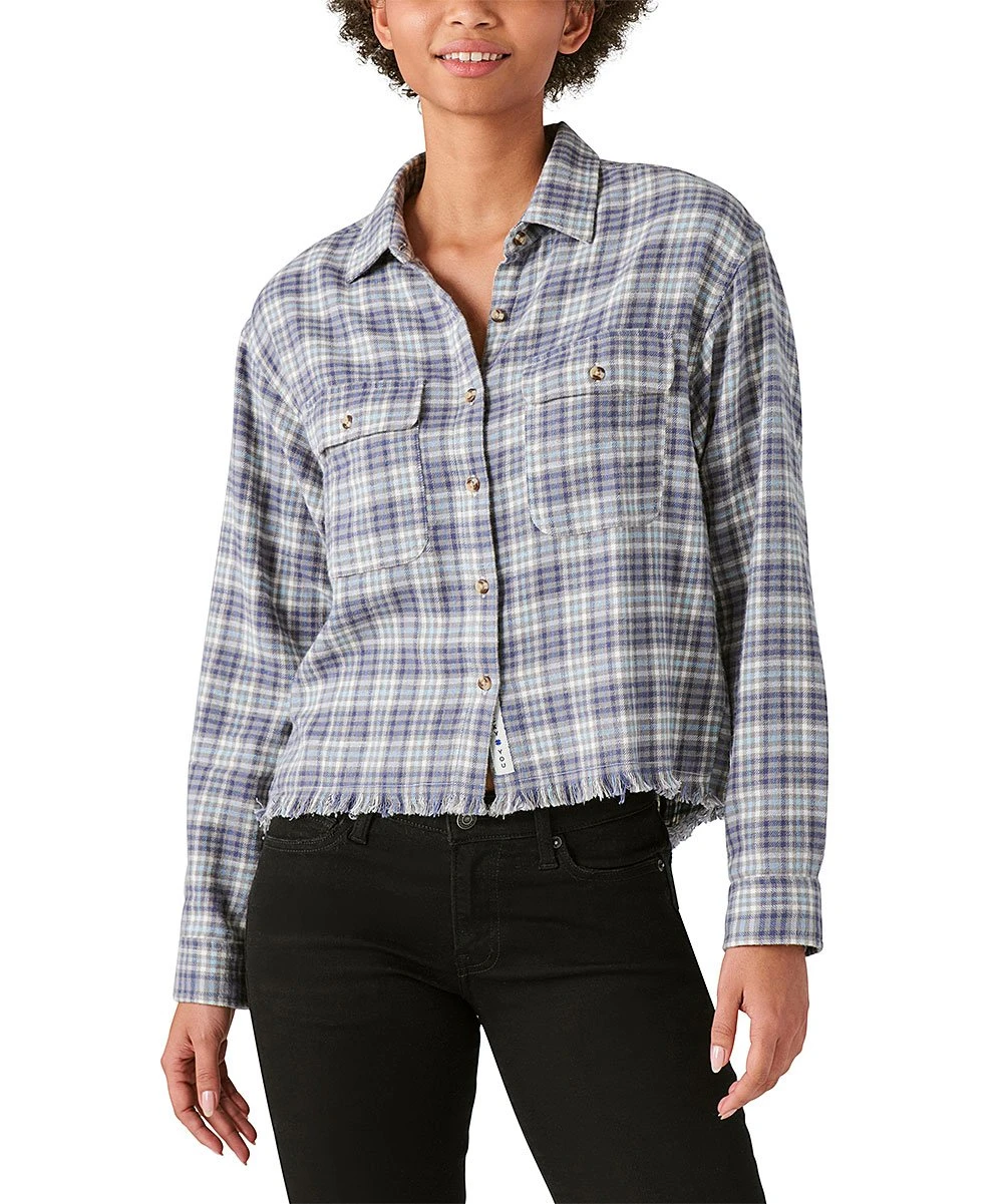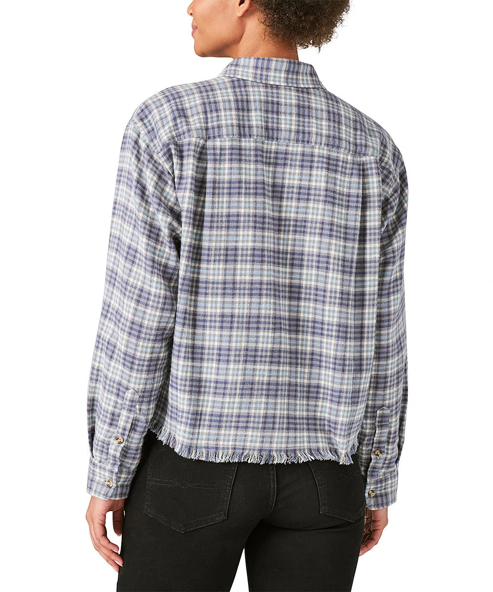 This cotton button-up features a cropped, raw-edge hem and a plaid print.