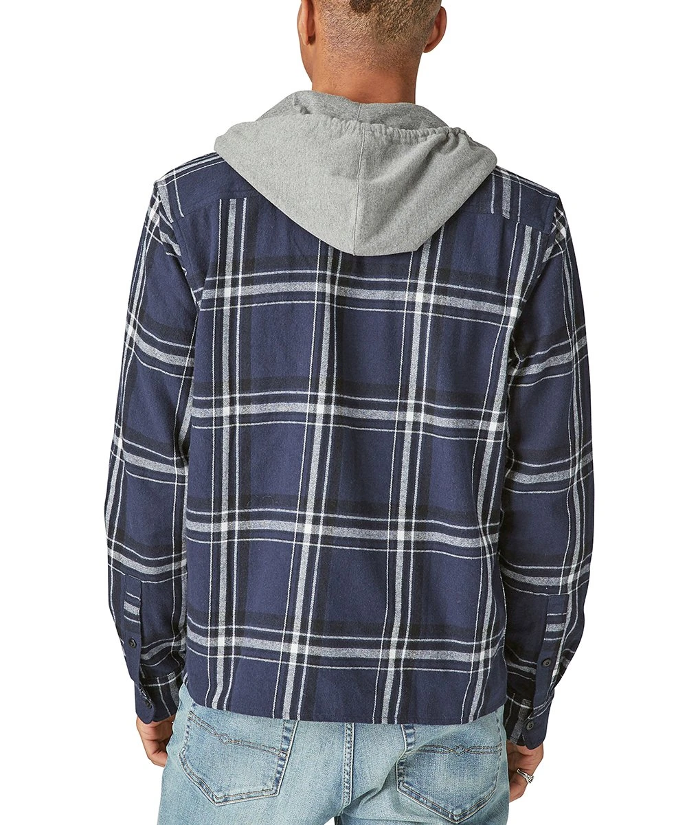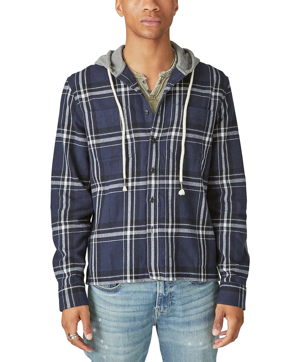 Soft, lightweight cotton top with a button-front placket and a loose, drawstring hood. Classic plaid print.