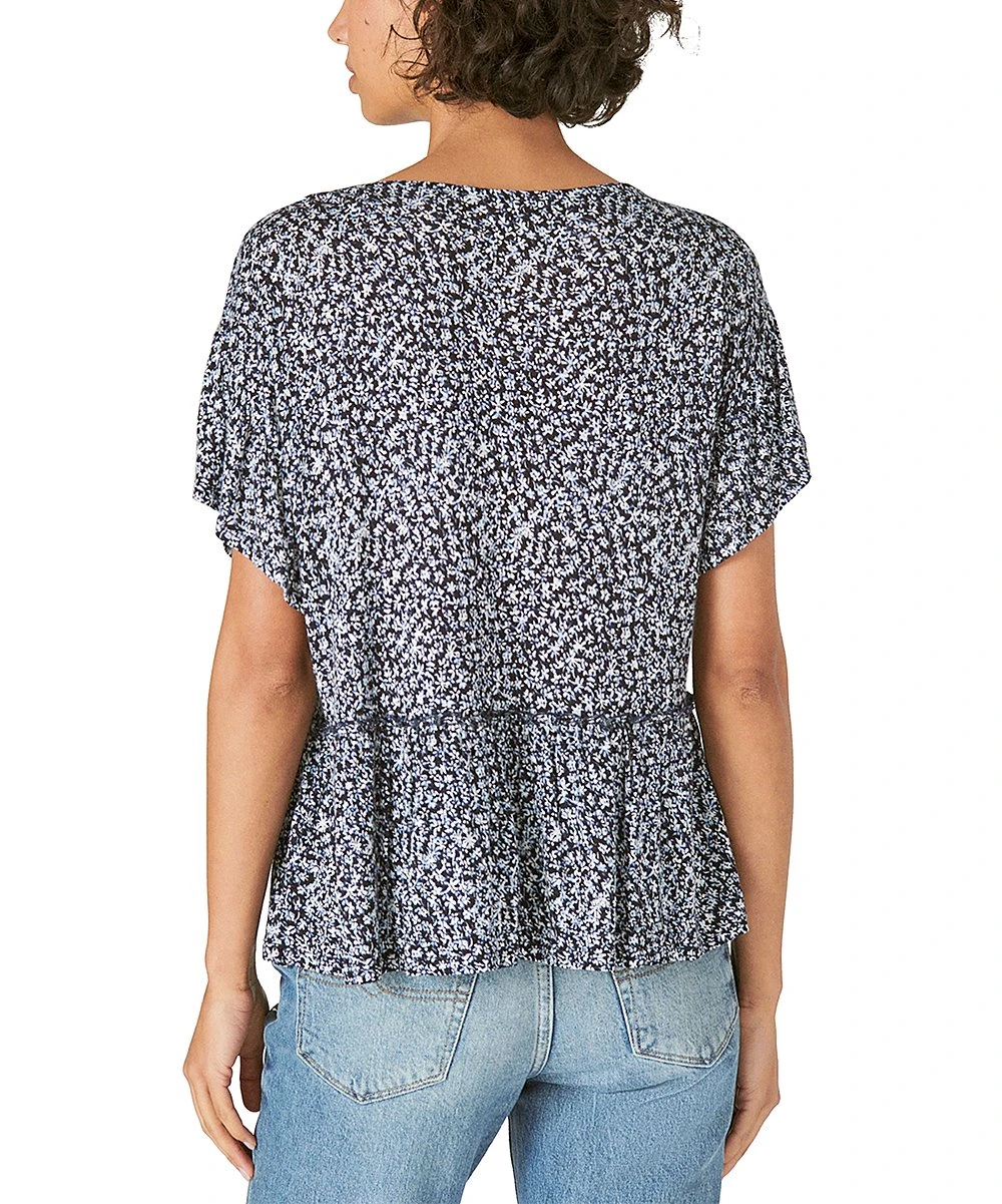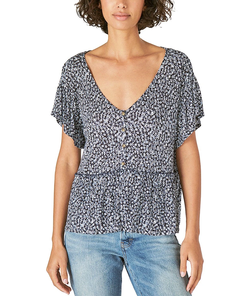 Accented with tortoise-print buttons, a plunging neckline and a ruffled hem, this top is your free-spirited soulmate.